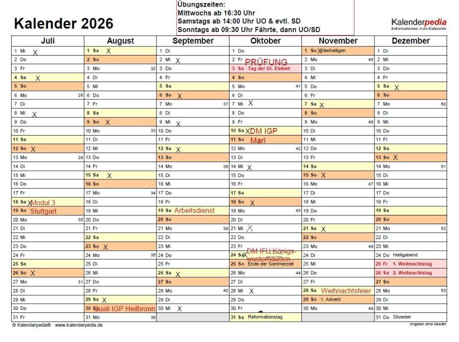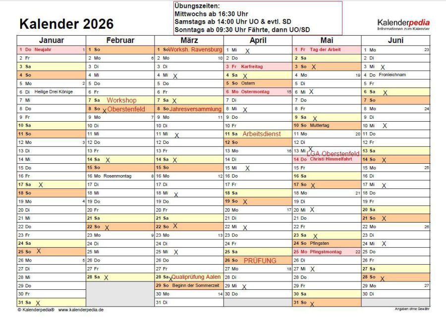 Samstag und Sonntag im Wechsel (siehe Kalender oben)